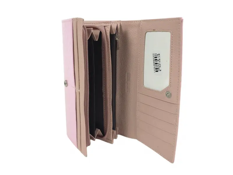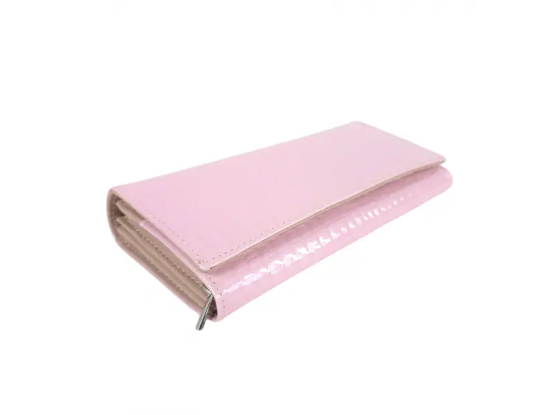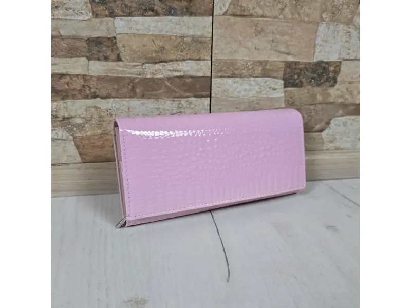 Portofel roz de damă, confecționat din piele naturală și piele lăcuită. Portofel mare de damă, cu compartimente pentru bancnote, sloturi pentru carduri și documente personale și un portofel pentru monede cu fermoar. Portofel frumos de damă, cu un design interesant.
