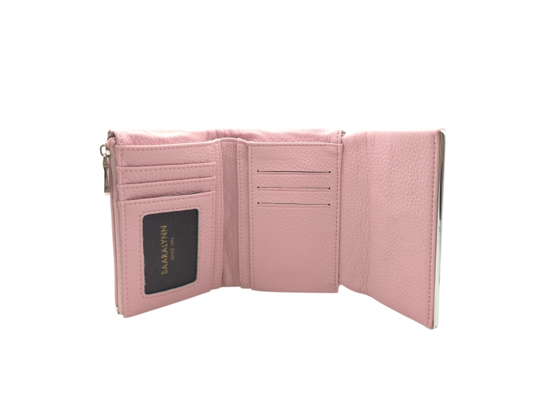 Portofelul dispune de compartimente pentru carduri, un compartiment pentru bancnote și un buzunar cu fermoar pentru monede.