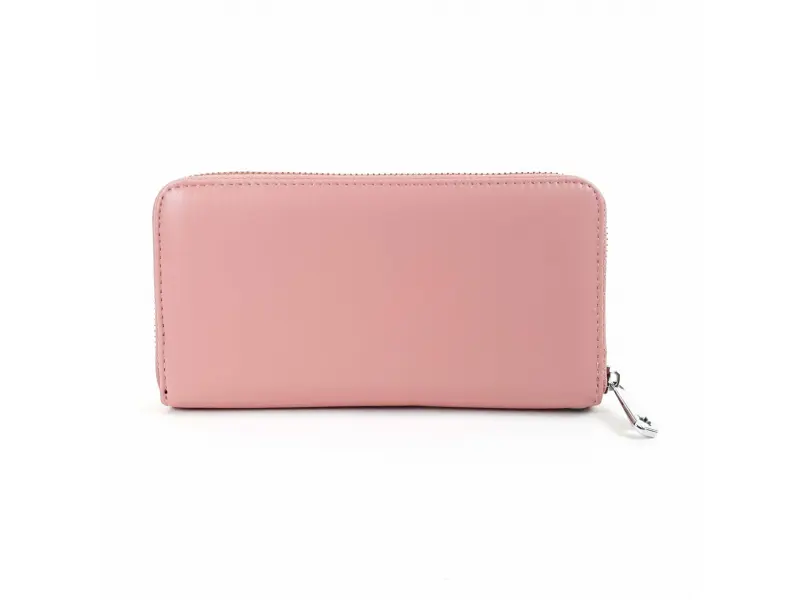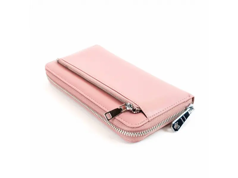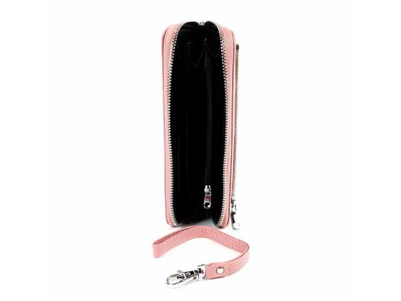 Portofel de damă de înaltă calitate, confecționat din piele naturală, de culoare roz. Portofel confortabil pentru femei, cu compartimente pentru bancnote, spațiu pentru carduri și documente personale, buzunar interior pentru monede cu fermoar, buzunar spate cu fermoar și mâner. Portofel cu protecție RFID.