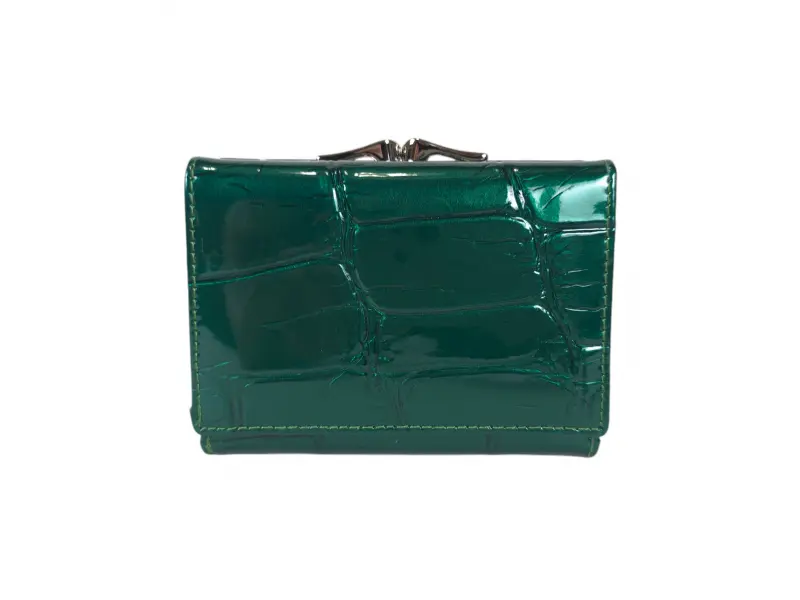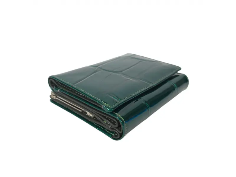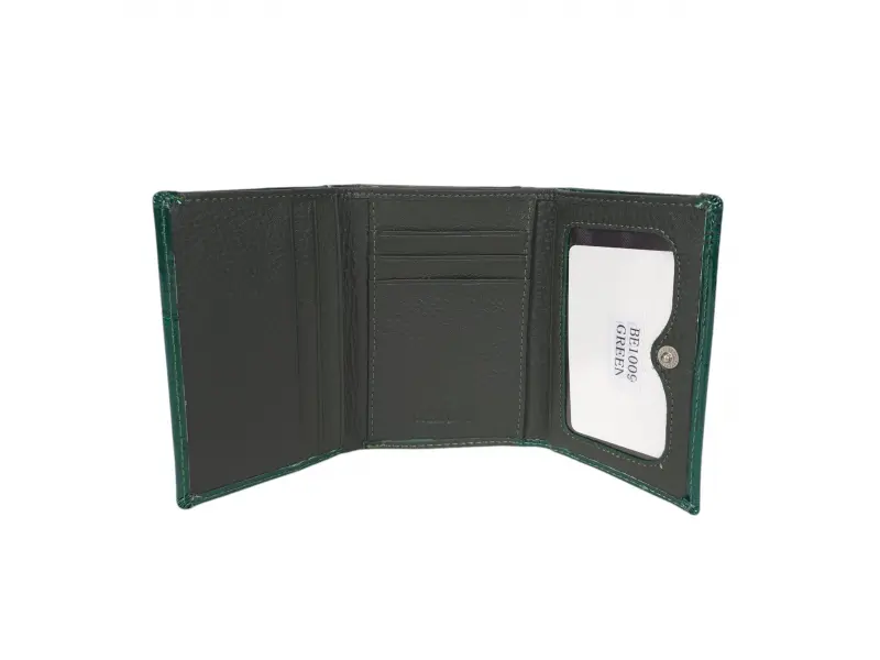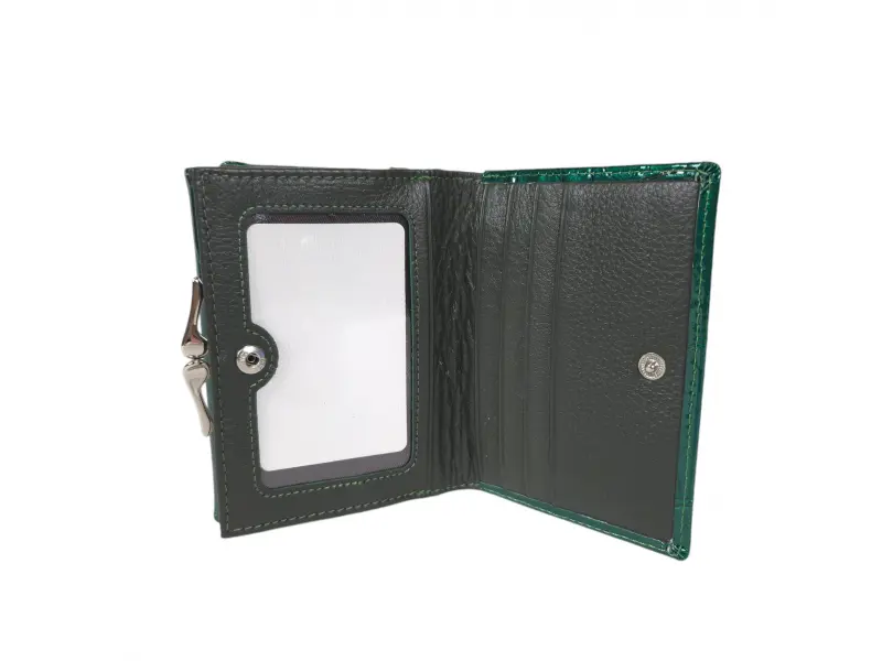 Portofel verde de damă, confecționat din piele naturală și piele lăcuită. Portofel mediu de damă cu compartimente pentru bancnote, sloturi pentru carduri și acte de identitate și un buzunar pentru monede cu fermoar. Portofel elegant de damă, cu un design interesant.