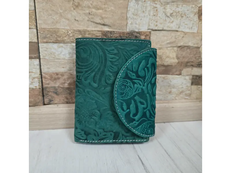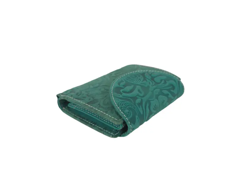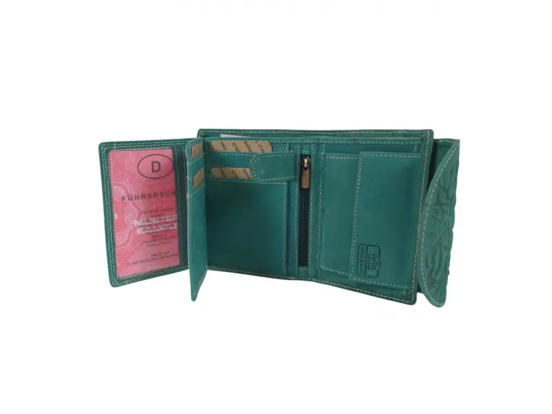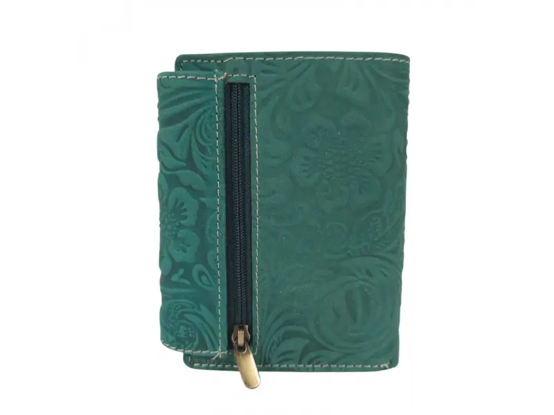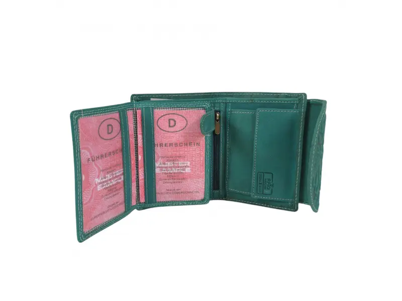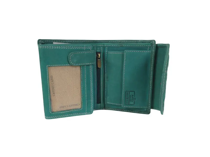 Poșetă verde pentru femei din India - Poșetă de damă confecționată din piele naturală. - Închidere cu un buton de clic. - Compartimente pentru carduri. - Compartimente pentru bancnote. - Buzunar interior pentru monede cu nasture. - Buzunar interior cu fermoar. - Buzunar spate cu fermoar.