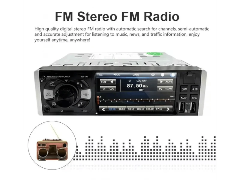Radioul auto MP5, modelul 4053AI, este un dispozitiv multimedia auto modern care combină o gamă largă de funcții de redare media, oferind utilizatorilor o experiență audiovizuală de calitate în mașină.