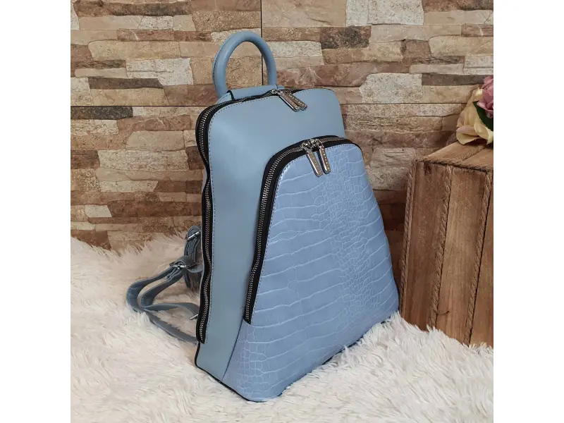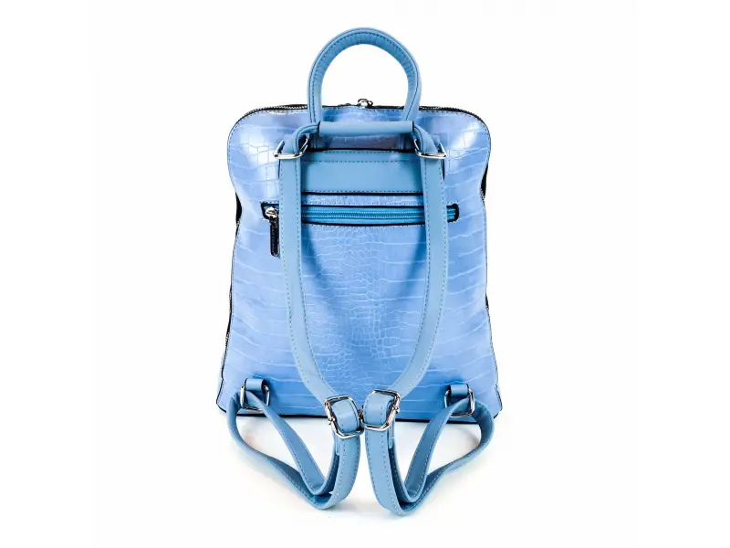 Rucsac de damă interesant, confecționat din piele ecologică, care poate fi purtat și ca geantă de mână. Rucsac de damă albastru deschis, cu un compartiment principal cu fermoar, un buzunar interior mic cu fermoar, un loc pentru telefon și documente, un buzunar frontal și unul posterior cu fermoar. Rucsac modern cu bretele reglabile confortabile.