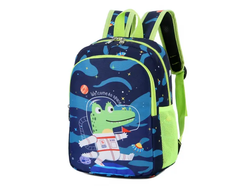 Rucsac pentru copii potrivit pentru un băiat cu un dinozaur. Rucsac cu un compartiment mare cu fermoar, o despărțitură mică, un buzunar frontal cu fermoar, două suporturi pentru sticle, un mâner de transport și bretele reglabile.
