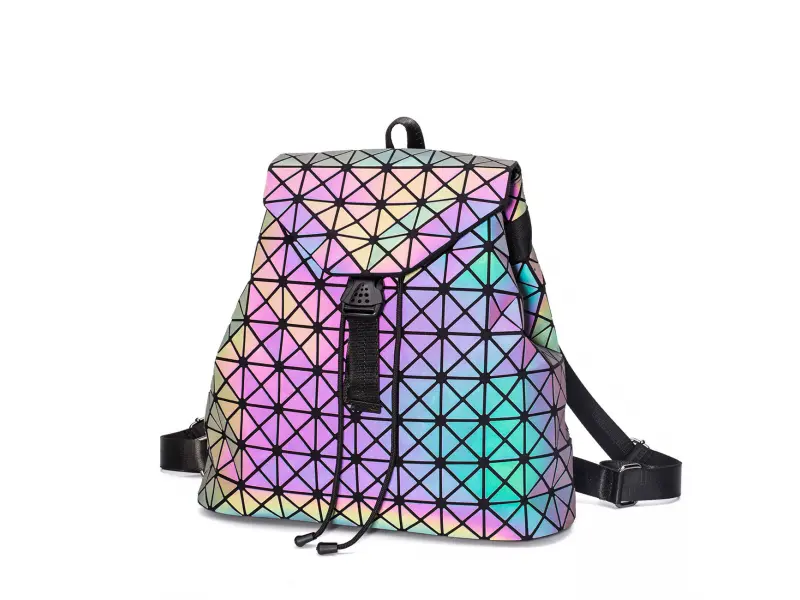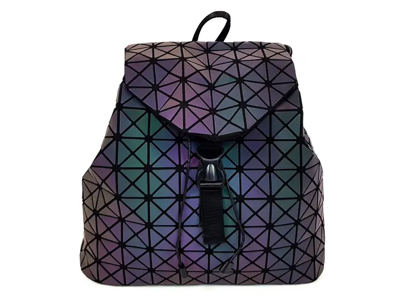 Rucsac de damă interesant, tip geantă, cu un compartiment mare, care se fixează cu șireturi și se închide cu un capac. Rucsac de damă de culoare cameleon, care își schimbă culoarea în funcție de lumină. Rucsac cu bretele reglabile și mâner pentru agățare.