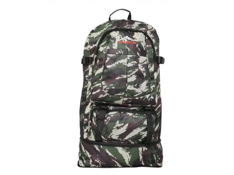 Rucsac mare pentru drumeții, confecționat din material textil de calitate. Rucsac bărbătesc cu dimensiune reglabilă și fermoar. Rucsac camuflaj potrivit pentru munți și drumeții.