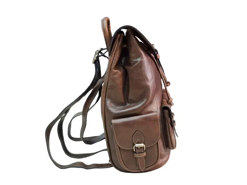 Rucsac de damă din piele, de culoare maro, confecționat din piele 100% naturală. Model vintage deosebit, cu un compartiment mare închis cu legături de piele și un capac cu închidere magnetică, un buzunar frontal și două buzunare laterale închise cu curea, un buzunar interior cu fermoar, un buzunar interior fără fermoar, mânere reglabile din piele și un mâner stabil pentru purtare în mână.