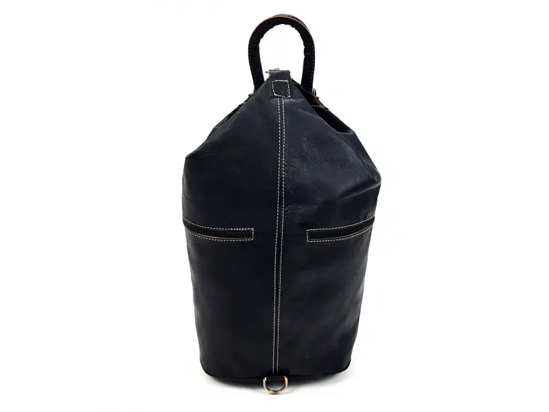 Rucsac de damă de înaltă calitate, confecționat din piele naturală de culoare neagră. Rucsac cu o formă interesantă, un compartiment mare cu buzunar interior, două buzunare laterale mici și bretele reglabile. Rucsac lucrat manual în Maroc.