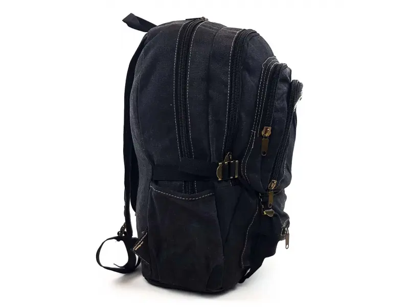 Rucsac din pânză neagră extrem de robust, multe compartimente, fermoare metalice ușor de deschis și închis, suporturi pentru sticle, bretele reglabile care comprimă volumul rucsacului. Rucsac foarte mare și robust, potrivit pentru ieșiri, vânătoare și pescuit, chiar și pentru școală. Căptușeală interioară rezistentă și impermeabilă.