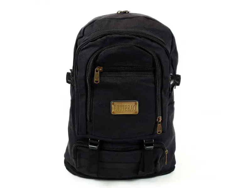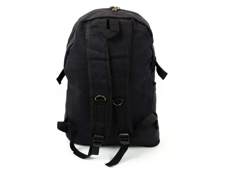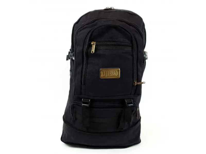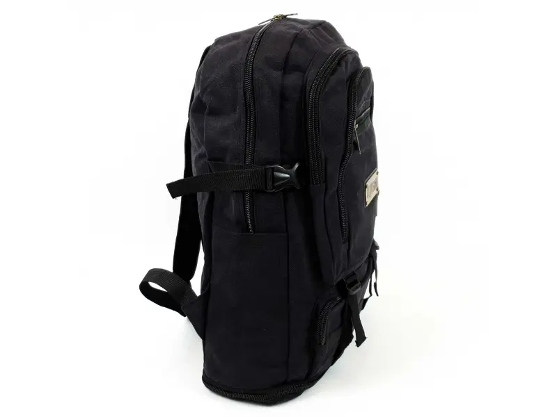 Rucsac robust din pânză neagră, multe compartimente, fermoare metalice ușor de deschis și închis, sloturi pentru sticle, extensie suplimentară. Căptușeală interioară rezistentă și impermeabilă. Rucsac cu bretele reglabile.