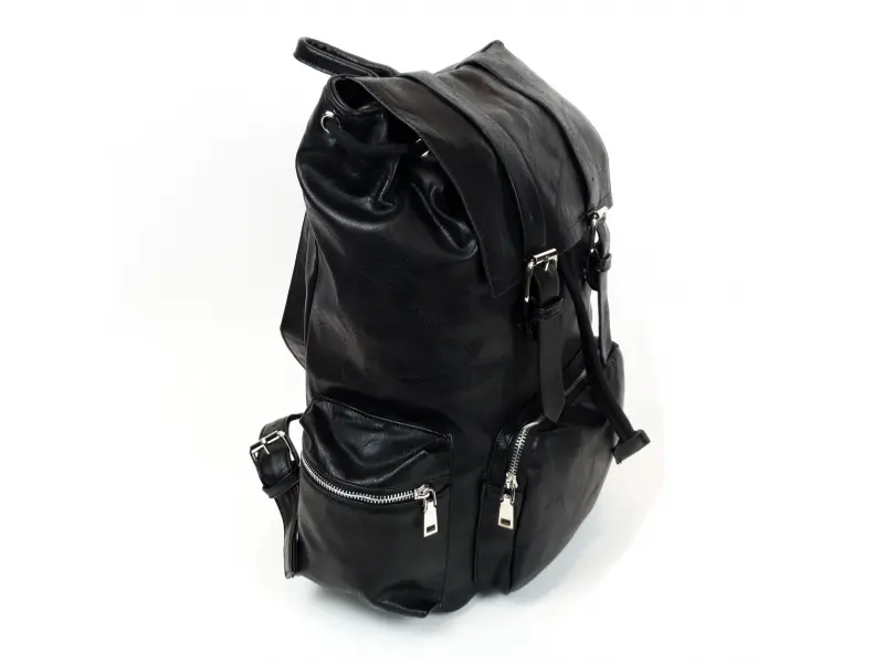 Rucsac mare din piele ecologică de calitate, model unisex - potrivit atât pentru bărbați, cât și pentru femei. Rucsac negru cu un compartiment mare, închis cu șireturi și capac care se închide cu cleme metalice. Rucsac cu un buzunar interior mic cu fermoar și un compartiment mic, buzunare frontale și laterale care se închid cu fermoar, mâner de transport și bretele reglabile din piele.