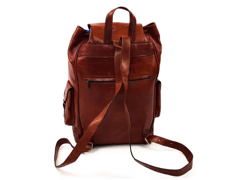 Rucsac mare din piele naturală, de culoare maro-roșiatică. Piele naturală de înaltă calitate, rucsac cu un compartiment mare închis cu legături de piele și un capac cu curea, buzunar frontal și buzunare laterale mici, bretele reglabile din piele, buzunar spate cu fermoar și mâner din piele pentru agățare sau transport.