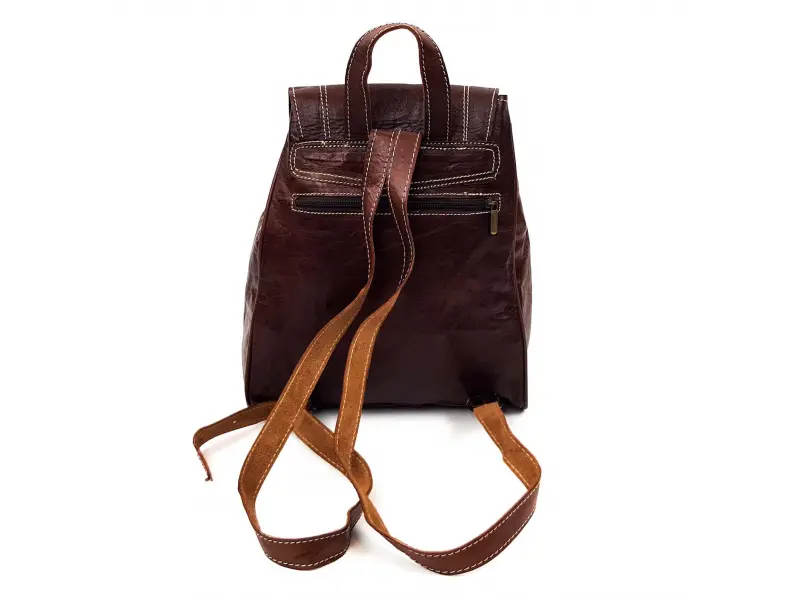 Rucsac de damă din piele naturală de culoare maro importat din Maroc, model deosebit cu un compartiment mare, un buzunar interior și un buzunar la spate cu fermoar. Compartimentul mare se închide cu șnururi din piele și nasture magnetic. Rucsac în stil vintage pentru cunoscători.