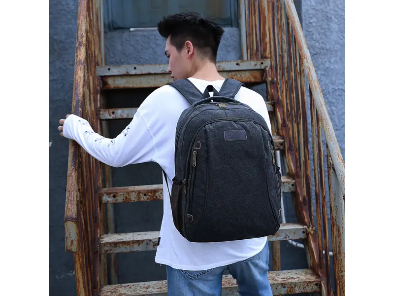 Rucsac negru din pânză Rucsac mare din pânză, impermeabil și extrem de rezistent. Rucsac de calitate cu două compartimente principale cu fermoar, compartiment interior, două buzunare frontale cu fermoar și două compartimente laterale pentru sticle. Rucsac cu mâner robust și bretele de umăr confortabile și reglabile.