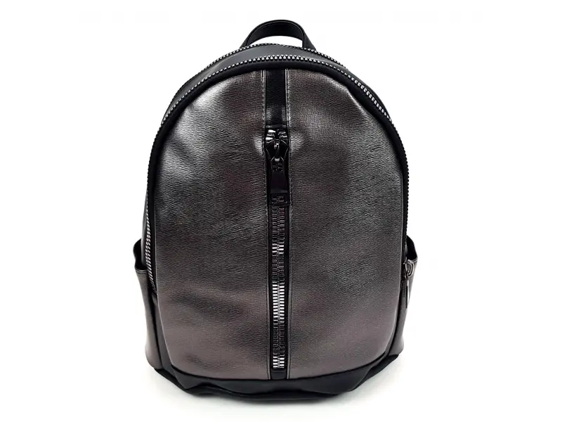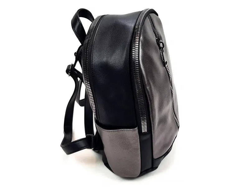Rucsac de calitate, fabricat în Bulgaria. Rucsac de damă argintiu închis, cu două compartimente mari care se închid cu fermoar stabil, un buzunar interior mic și un compartiment pentru telefon și documente. Rucsac cu două compartimente laterale, buzunar spate și frontal cu fermoar, mâner de transport stabil și bretele de umăr reglabile.