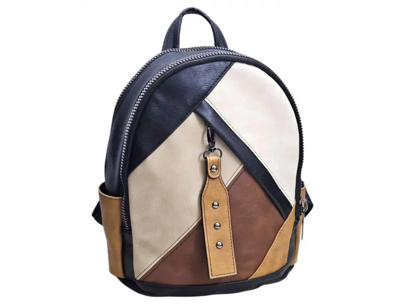 Rucsac din piele ecologică multicolor - Două compartimente principale cu fermoare rezistente - Buzunar frontal cu fermoar - Buzunar spate cu fermoar. - Compartimente laterale pentru sticle. - Buzunar interior mic cu fermoar. - Compartimente interne pentru chei și telefon. - Mâner pentru transport în mână. - Bretele reglabile. Există diferite variante de plasare a culorilor.