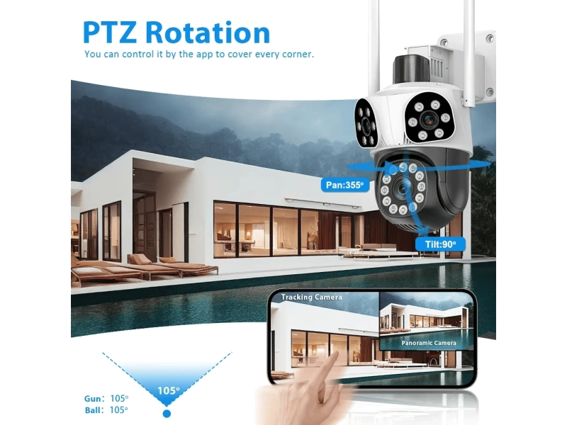 Vă prezentăm o cameră triplă WiFi modernă pentru exterior , care oferă supraveghere video clară, cu rezoluție înaltă de 12 MP , zoom 10x și urmărire inteligentă a mișcării . Potrivită pentru acasă, birou, curte sau spații comerciale, garantează o vizibilitate perfectă în toate condițiile!