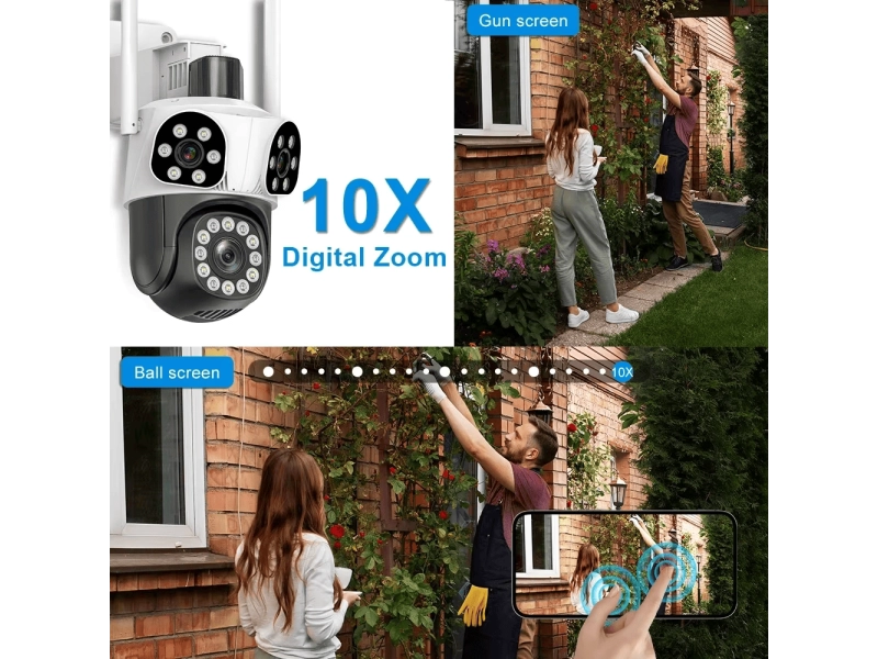 Vă prezentăm o cameră triplă WiFi modernă pentru exterior, care oferă supraveghere video clară ca cristalul, cu rezoluție înaltă de 12 MP, ZOOM 10x și urmărire inteligentă a mișcării. Potrivită pentru acasă, birou, curte sau spații comerciale, garantează o vizibilitate perfectă în toate condițiile!