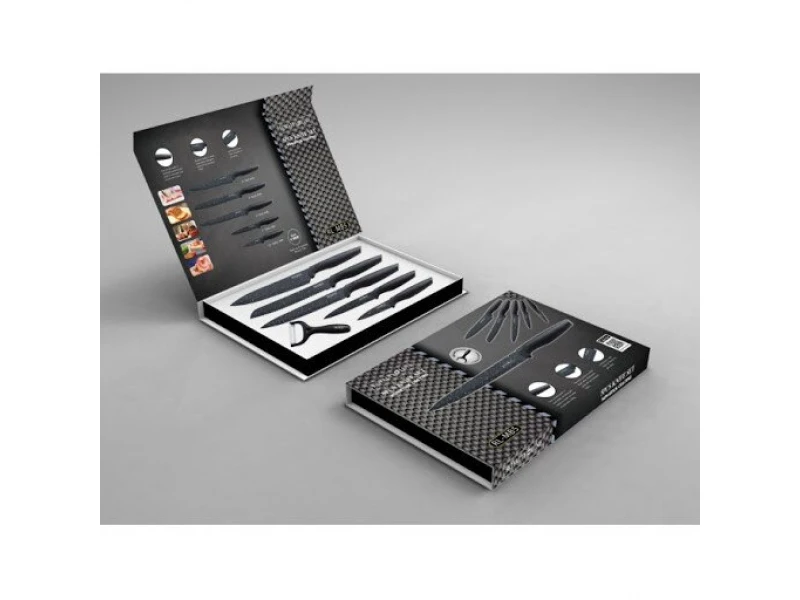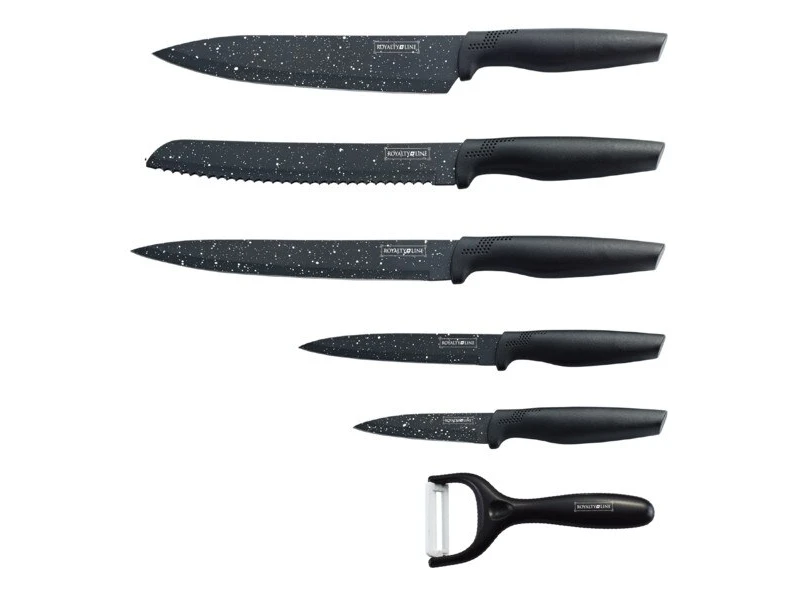 Set unic de cuțite și curățător de legume Royalty Line RL-ML5B. Au un înveliș antiaderent din marmură care previne lipirea alimentelor.