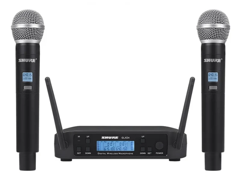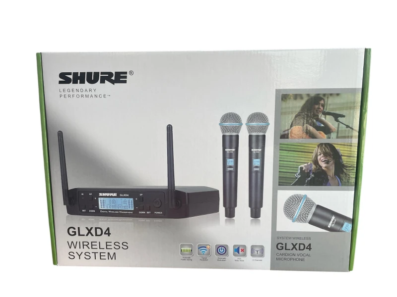 Set profesional Shure GLXD4 - 2 microfoane wireless și receptor UHF cu diversity, afișaj LCD, selecție automată a frecvenței și rază de acțiune de până la 60 m.