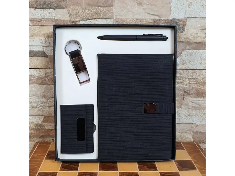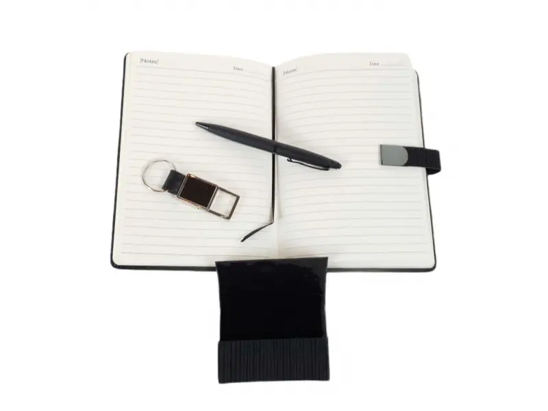 Set business negru, conținând un pix, un caiet, un breloc și o carte de vizită, confecționat din material textil de calitate.