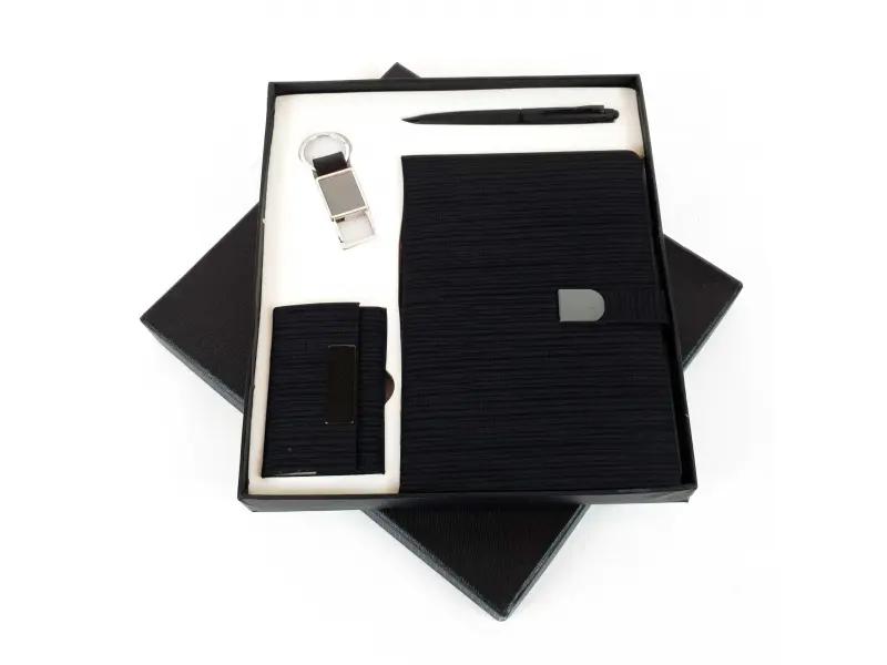 Set business negru, conținând un pix, un caiet, un breloc și o carte de vizită, confecționat din material textil de calitate. Caiet negru cu închidere magnetică și bandă divizoare. Lungime: 14,5 cm. Înălțime: 21 cm. Suport rigid de înaltă calitate pentru cărți de vizită, potrivit pentru cărți de vizită, felicitări și documente. Lungime: 10 cm. Înălțime: 7 cm. Breloc din piele și metal. Pix elegant cu bilă, negru mat.