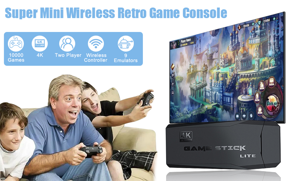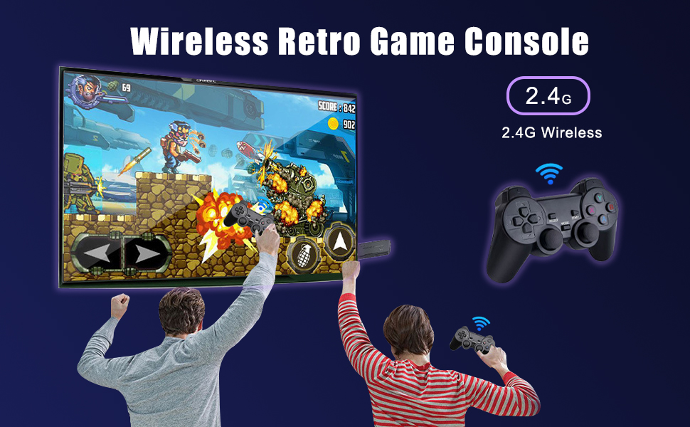Consolă de jocuri portabilă wireless cu două controllere de 2,4 GHz, cadou ideal pentru copii și adulți. Peste 10.000 de jocuri clasice încorporate.