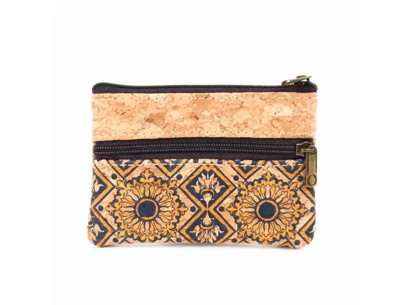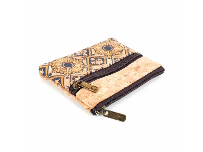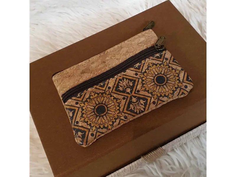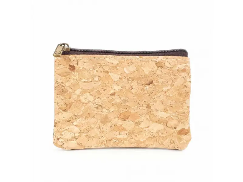 Portofel mic din plută. Portofel confecționat din material ecologic, cu două compartimente cu fermoar, cu spațiu pentru bancnote și monede.