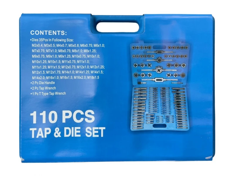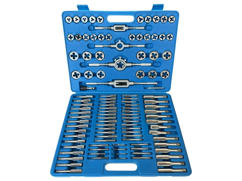 Alegeți acest set de filiere și tarozi Kraft cu 110 piese pentru toate nevoile dumneavoastră de filetare și reparații - de la piulițe fine pentru mașini la șuruburi mai mari.