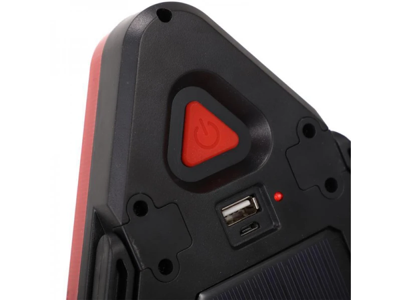 Triunghi LED 3 în 1, lanternă de avarie și de lucru pentru mașină. Un articol foarte util care ar trebui să fie prezent în fiecare mașină. Lampa poate fi folosită ca iluminat de avarie; pentru camping sau în natură. Bateria reîncărcabilă încorporată se încarcă cu un cablu USB inclus în kit sau prin intermediul panoului solar încorporat. Există o ieșire USB prin care puteți încărca bateria unui telefon sau a altor dispozitive cu un cablu USB. Pe spate există un suport, care devine și un cârlig pentru agățare și un mâner de transport. Moduri de iluminare: 1. Mod lampă COB puternică 2. Mod economic pentru lampa COB 3. Triunghi luminos 4. Clipire rapidă a triunghiului 5. Triunghi intermitent SOS