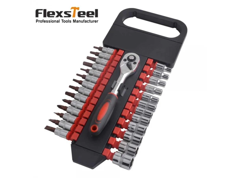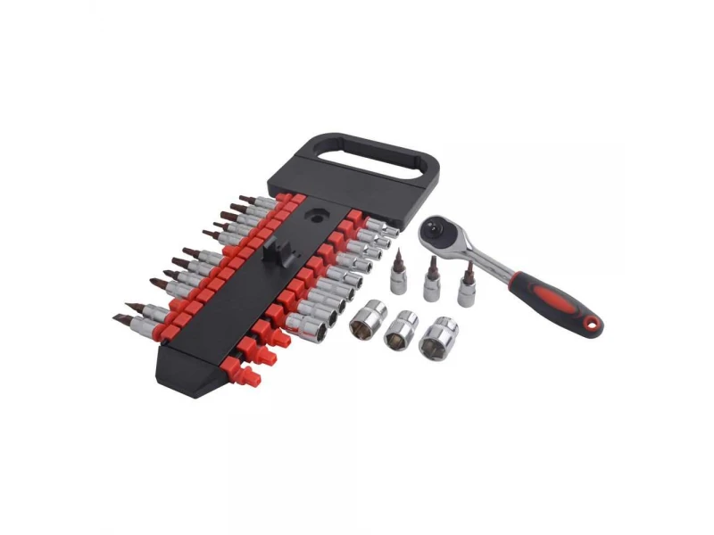 Set 1/4 - 27 bucăți 12 bucăți de inserții hexagonale: 4; 4,5; 5; 5,5; 6; 7; 8; 9; 10; 11; 12; 13 mm 14 bucăți de inserții cu vârf: Steaua T10; T15; T20; T25; T30 Șurubelniță Phillips PH1; PH2 Șurubelniță dreaptă 4; 5,5; 7 mm. 1 buc. - Clichet Greutate - 700g