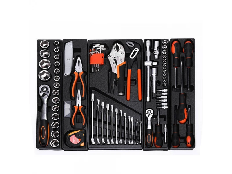 O cutie metalică robustă care se deschide, astfel încât să aveți mereu la îndemână uneltele și consumabilele. KITUL INCLUDE: 18 x Chei tubulare (1/2″) 10, 11, 12, 13, 14, 15, 16, 17, 18, 19, 20, 21, 22, 23, 24, 27, 30, 32 mm 1 x Mâner cu clichet cu eliberare rapidă (1/2″) 1 x extensie de 5″ (1/2″) 1 x extensie de 10″ cu adaptor cu 3 căi (1/2″) 1 x Conector (1/2″) 12 x Tubulare (1/4″): 4, 4,5, 5, 5,5, 6, 7, 8, 9, 10, 11, 12, 13 mm 1 x Mâner cu clichet cu eliberare rapidă (1/4″) 1 x extensie de 3″ (1/4″) Tubulare cu 6 biți de șurubelniță 1 x Șurubelniță tubulară 1 x Clește cu vârf ascuțit 6″ 1 x Clește combinat de 7″ 1 x 3 m jaluzea tip rulou 1 x Cuțit de tăiat 10 x Lame de rezervă 5 x șurubelnițe: 5 x 75, 6 x 100, 8 x 150 mm, PH1 x 75 mm, PH2 x 100 mm 1 x Clește pentru pompă de apă 10″ 1 x clește de prindere de 10″ 9 x Chei hexagonale 1,5-10 mm 12 x Chei fixe – 6, 8, 9, 10, 11, 12, 13, 14, 15, 16, 17, 19 mm 1x Valiză metalică
