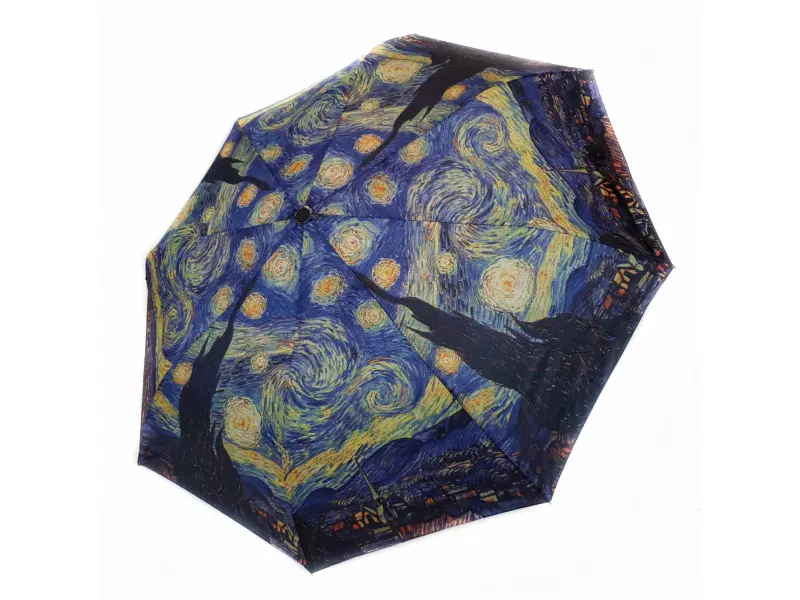 Umbrelă compactă pentru femei cu imaginea celebrului tablou Van Gogh - „Noaptea înstelată”. Umbrelă de înaltă calitate cu deschidere automată, material cu uscare rapidă, mâner confortabil și husă de depozitare. Înălțime pliată - 30 cm.