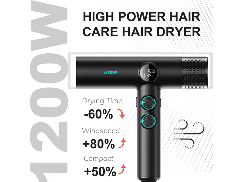 • Uscător de păr profesional VGR-401 negru cu ioni negativi, motor BLDC pentru uscare rapidă cu zgomot redus, afișaj LED