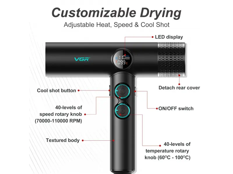 Uscătorul de păr VGR 401 oferă 40 de setări de temperatură (60-100°C) și 40 de viteze (7000-11000 rpm) , afișate pe un elegant ecran LED . Acest lucru vă oferă control perfect pentru fiecare tip de păr și fiecare aspect dorit.