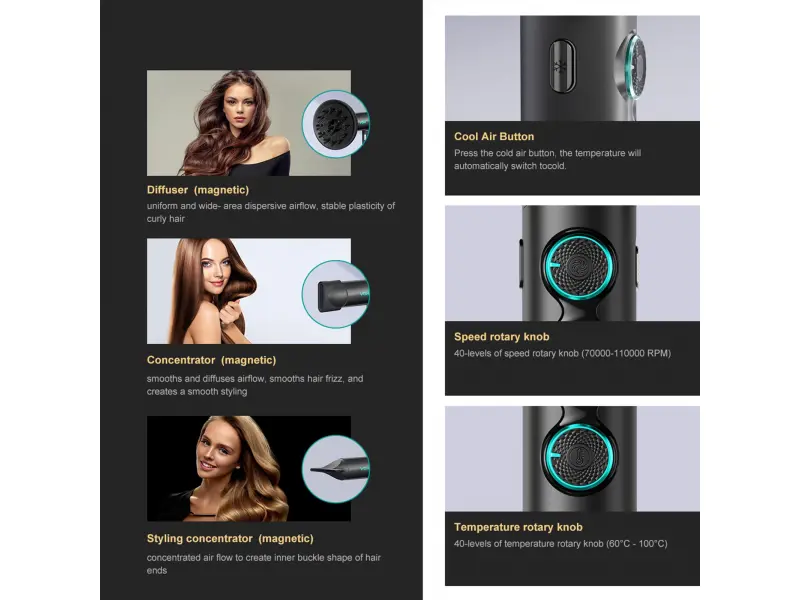 Designul compact și ușor, cu duze magnetice rotative la 360° și difuzor, asigură schimbarea ușoară a accesoriilor și confort în deplasare. Acest lucru îl face alegerea perfectă atât pentru uzul acasă, cât și pentru profesioniștii aflați în mișcare .