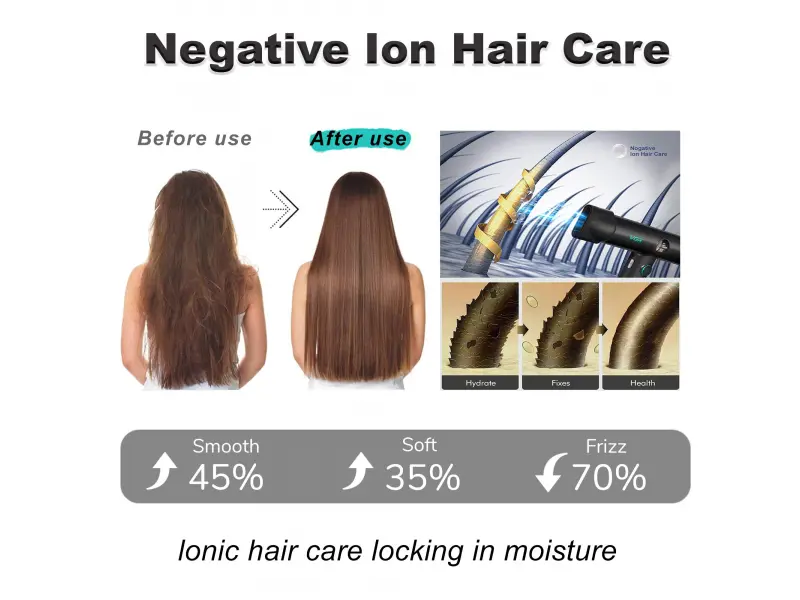 Datorită sistemului avansat de ioni negativi , te vei bucura de un păr neted, moale și vibrant , fără electricitate statică și păr încrețit. Coafura ta va arăta natural, strălucitoare și sănătoasă în fiecare zi!